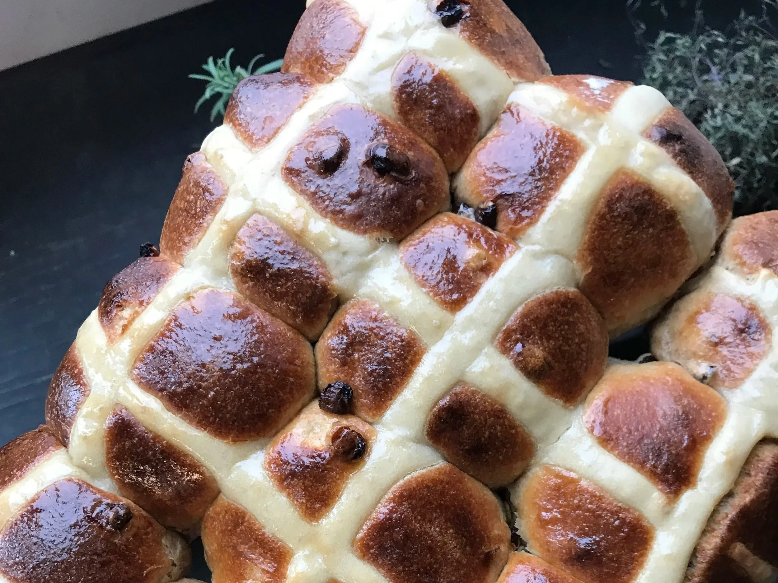 One a penny, two a penny…A classic Easter treat, made the FC way. We add warm spices and plump raisins and currants to egg-enriched sourdough, and top the warm buns with a sticky sweet glaze and the required piped cross. $17.00/6 buns