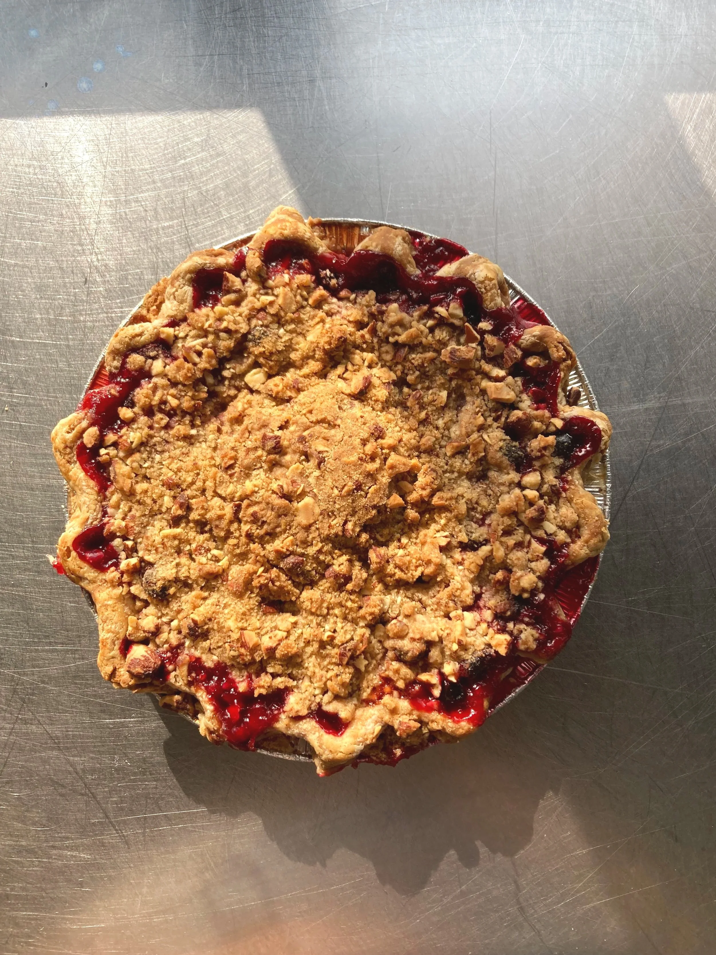 Ringing in spring the best way we know how - with rhubarb. Paired with our favourite berry (razz) and topped with a toasted almond crumble, this pie will make warm days come quicker, guaranteed. Serves 6-10. $28.00