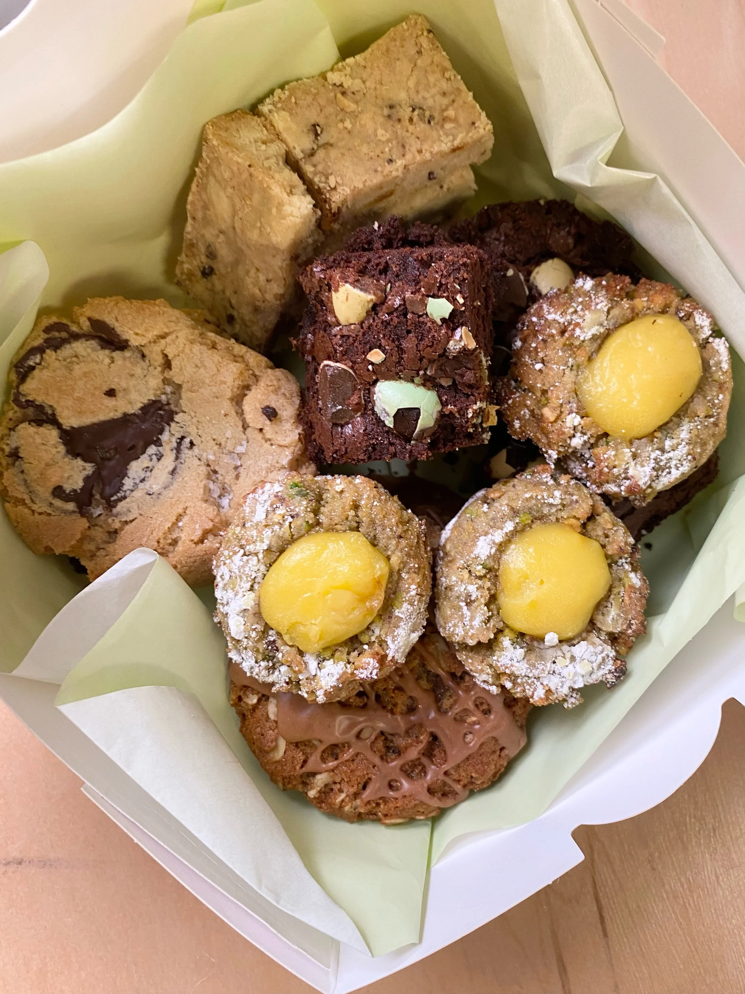 An 8x8" slab of everyone's favourite Easter treat: our mini egg brownies. Rich and fudgy brownies topped with a layer of white chocolate ganache and a generous sprinkling of crushed Cadbury Mini Eggs. Cut these to any size you need, whether it's a hefty slice with a scoop of ice cream, or as a tiny late night nibble.