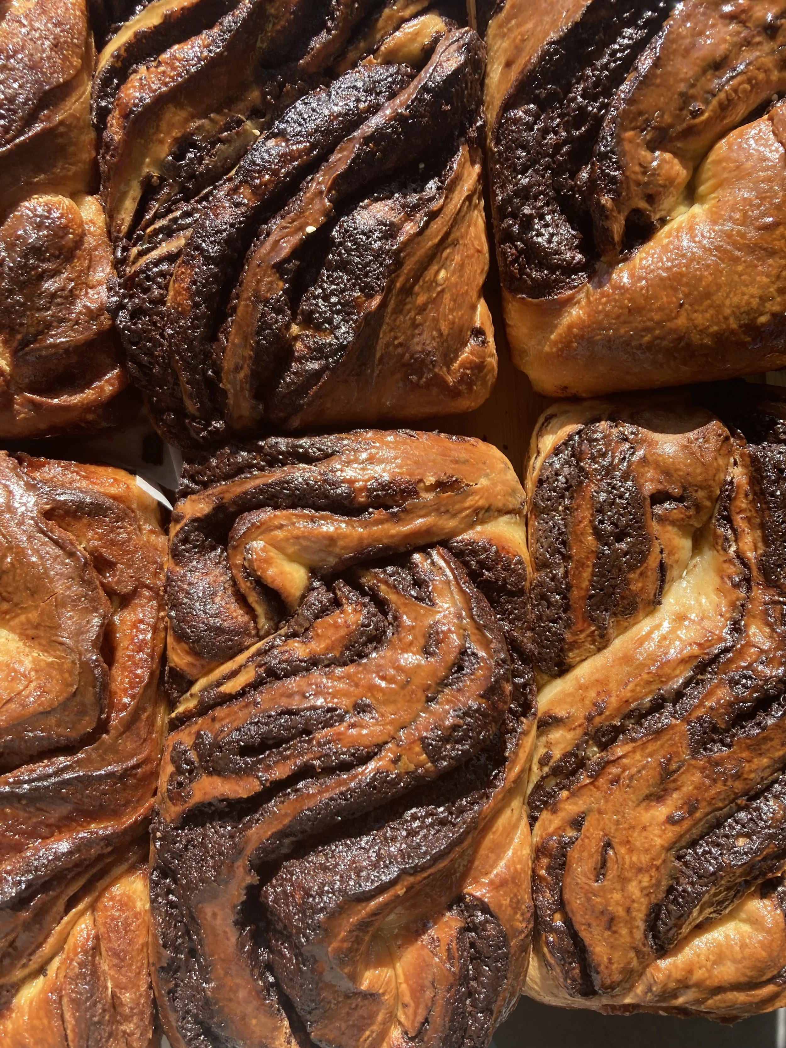 Egg-enriched sourdough swirled with your choice of chocolate or cinnamon, and topped with a sweet glaze. Sticky, rich, and sweet. $15.00/loaf